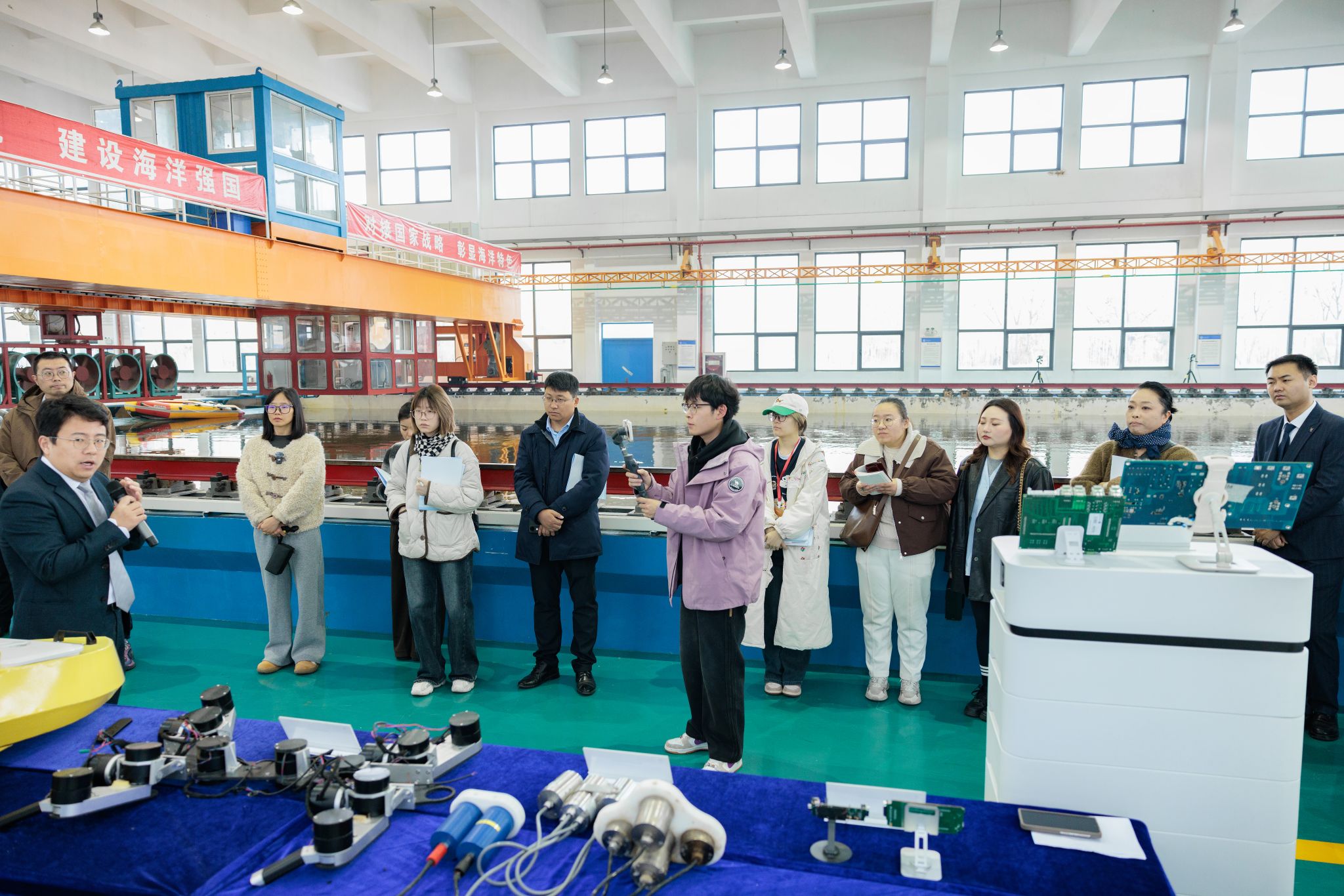 报道团先后到海洋工程技术研究中心、测绘楼实地采访。相关涉海学院学科带头人、项目负责人全面介绍了学校面向深远海养殖、海洋工程装备制造、海洋信息技术等新兴海洋产业和地方海洋经济支柱产业发展,开展科技攻关和成果转化情况。报道团记者对海洋新能源开发、传统渔业转型升级、无人船艇应用场景拓展,以及测绘与海洋气象、海洋生物制药、海洋食品开发等领域研究应用成果给予高度关注。