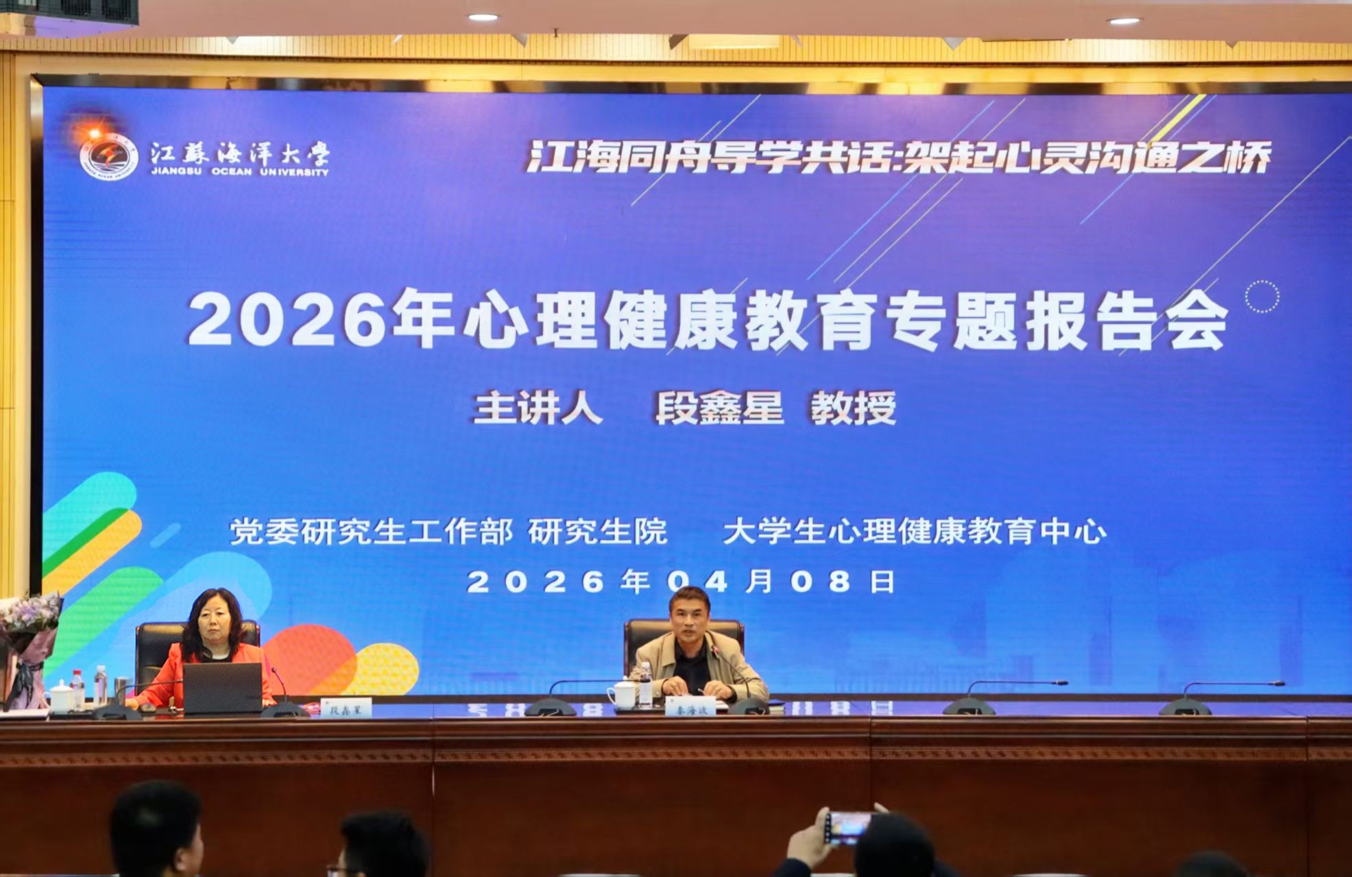 为进一步提升研究生心理健康素养,精准引导导师掌握研究生心理问题识别与干预方法,凝聚心理育人工作强大合力,4月8日下午,党委研究生工作部、研究生院联合大学生心理健康中心,在校会议中心黄海厅举办“江海同舟 导学共话 —— 架起心灵沟通之桥”研究生及导师心理健康教育专题报告会。全校16个研究生培养学院的研究生导师、教学秘书、辅导员,以及2025级研究生代表和研工部、研究生院相关工作人员,共计300余人踊跃参会。报告会由党委研究生工作部副部长、研究生院副院长秦海波主持。