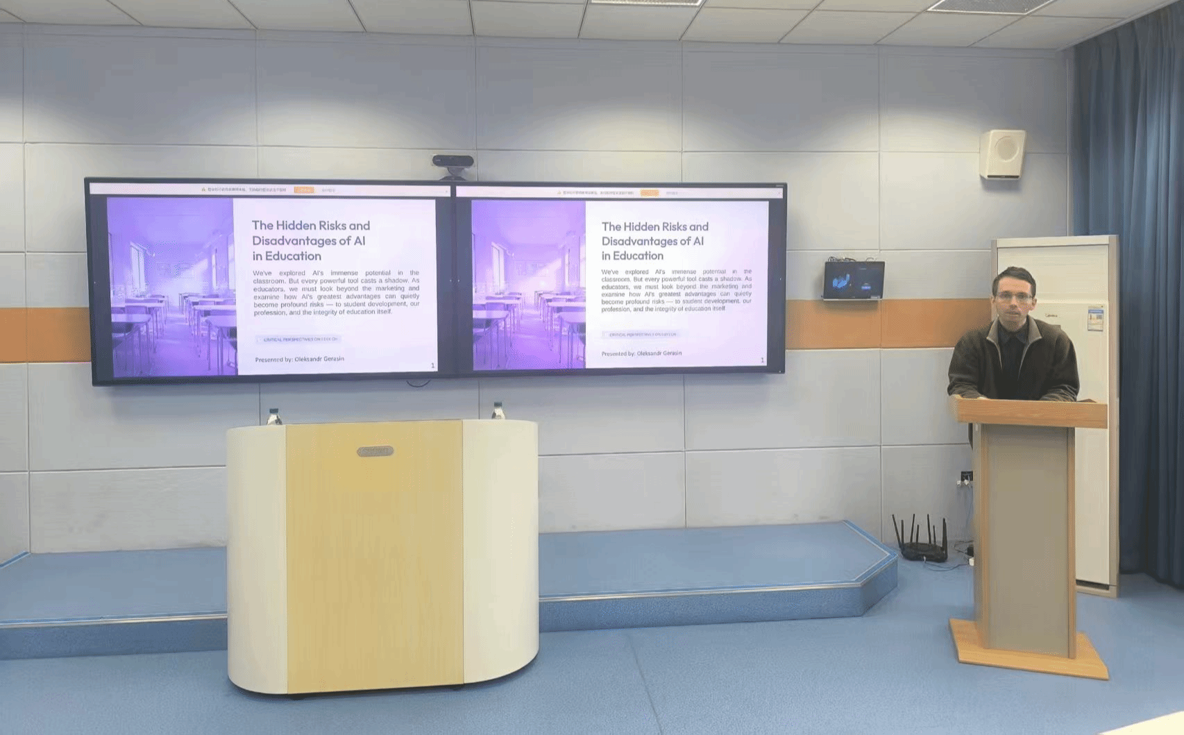 外籍教师Natalia Knyrik系统阐释了人工智能在教育领域的核心优势,肯定了AI在打造个性化学习路径、提供全天候智能辅导与即时反馈,大幅节省教师时间,提升特殊教育适配性与课堂参与度、早期干预课程优化等方面的优势,强调AI旨在赋能教师教学提升,助力释放学生潜能、推动教育公平与高质量发展。外籍教师Oleksandr Gerasin围绕人工智能在教育中的潜在风险作专题分享。他系统剖析AI可能导致学生毅力缺失、催生思维惰性、造成教师技能退化,存在算法偏见、弱化创造力等问题,强调教育应注重培养学生AI素养与思辨能力,理性使用AI、守护教育本质。