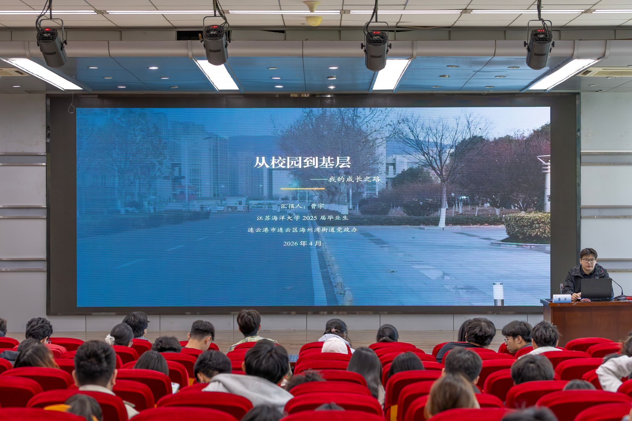 连云区海州湾街道党政办公务员、海州湾社区党支部副书记曹宇结合大学团学工作经历,系统讲解选调生选拔全流程,细致拆解笔试、面试备考重点与考察评定标准。同时结合自身岗位实际,分享基层党政办日常工作实务、群众沟通工作方法与一线基层工作真切感悟,勉励参训学员在实践中积累经验、锤炼过硬本领,于服务同学、扎根基层、奉献社会的过程中实现青春价值与人生理想。
