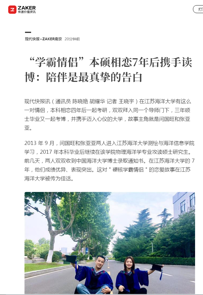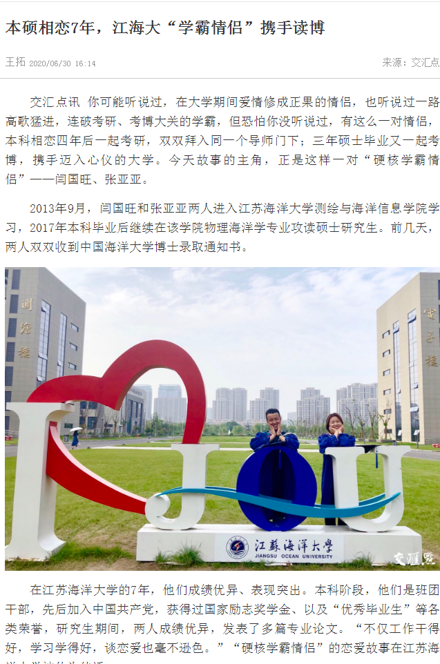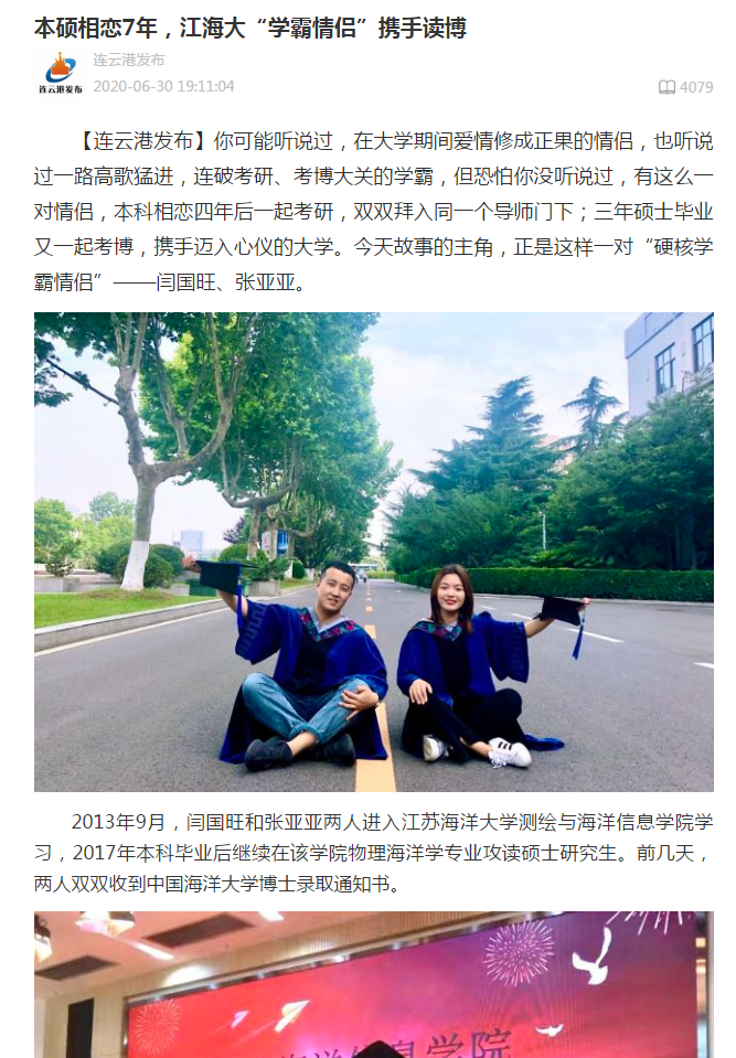 在江苏海洋大学的7年,他们成绩优异、表现突出。本科阶段,他们是班团干部,先后加入中国共产党,获得过国家励志奖学金、以及“优秀毕业生”等各类荣誉,研究生期间,两人成绩优异,发表了多篇专业论文。“不仅工作干得好,学习学得好,谈恋爱也毫不逊色。”“硬核学霸情侣”的恋爱故事在江苏海洋大学被传为佳话。