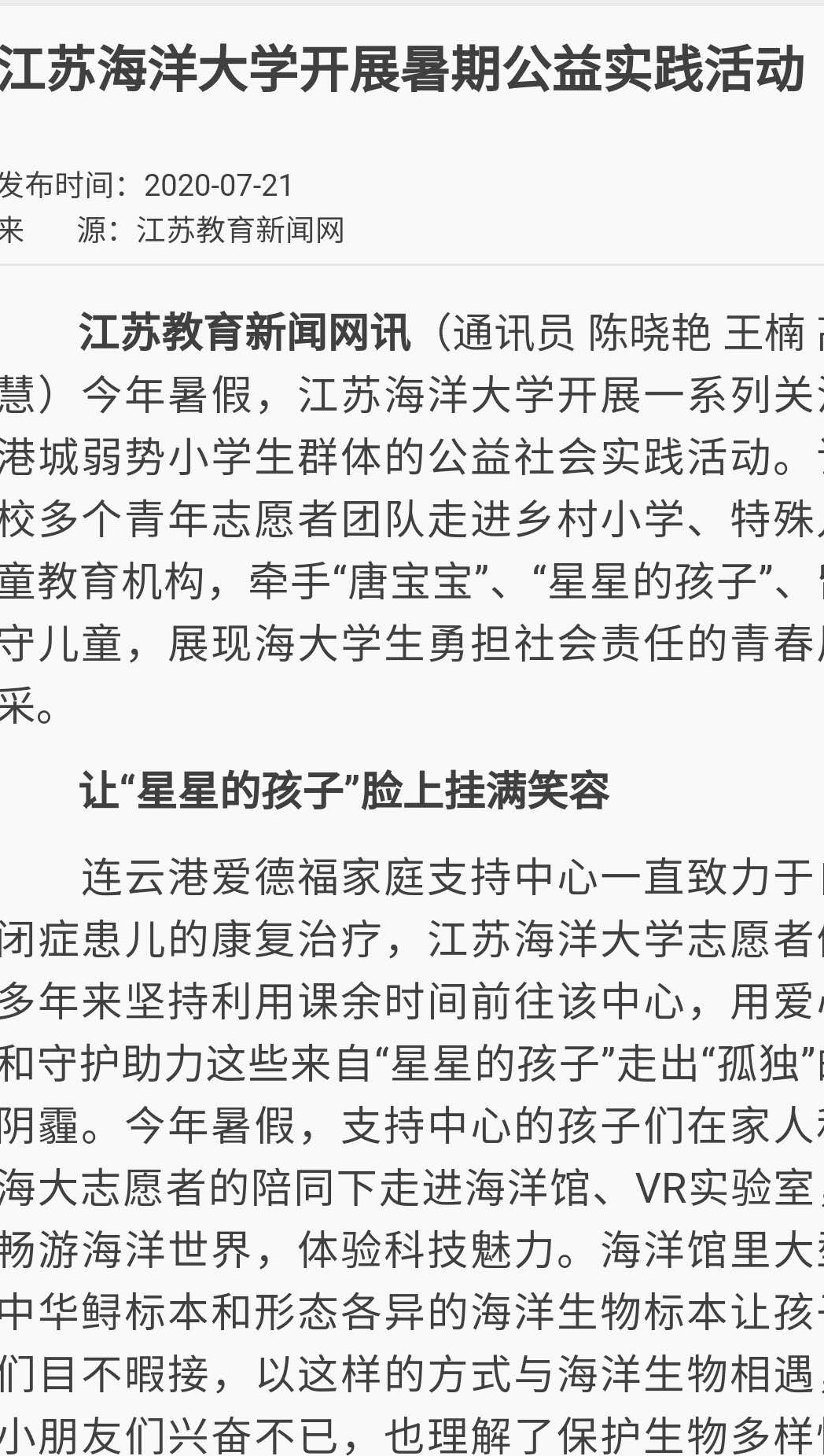 今年暑假,江苏海洋大学开展一系列关注港城弱势小学生群体的公益社会实践活动。该校多个青年志愿者团队走进乡村小学、特殊儿童教育机构,牵手“唐宝宝”、“星星的孩子”、留守儿童,展现海大学生勇担社会责任的青春风采。