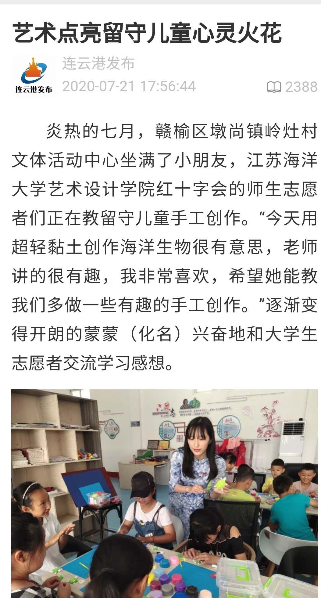 炎热的七月,赣榆区墩尚镇岭灶村文体活动中心坐满了小朋友,江苏海洋大学艺术设计学院红十字会的师生志愿者们正在教留守儿童手工创作。“今天用超轻黏土创作海洋生物很有意思,老师讲的很有趣,我非常喜欢,希望她能教我们多做一些有趣的手工创作。”逐渐变得开朗的蒙蒙(化名)兴奋地和大学生志愿者交流学习感想。
