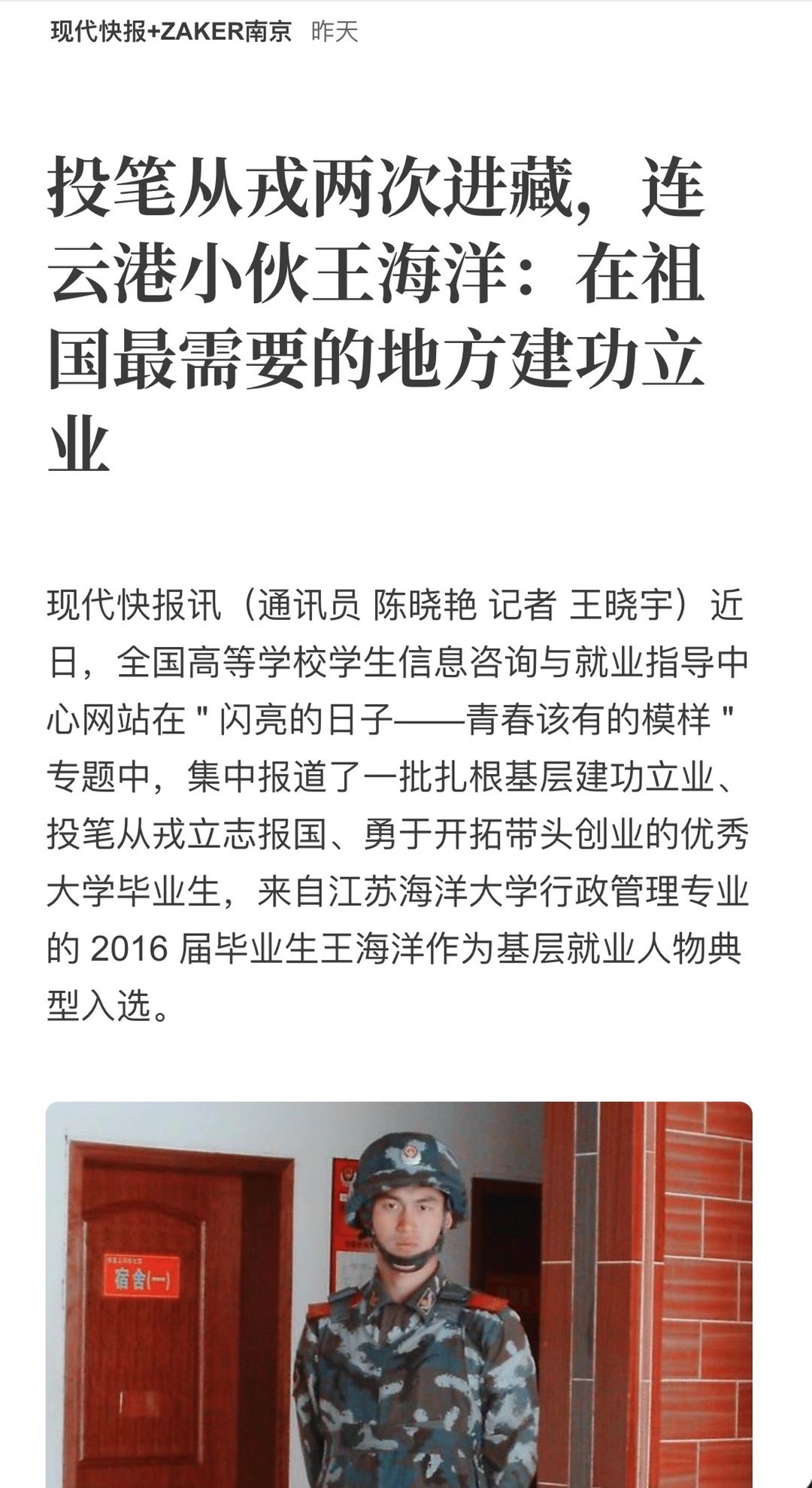 出生于1989年的赣榆小伙王海洋从小在海边长大,"小时候最期待的事情之一就是等待解放军叔叔去我们家乡海训,童年的快乐时光,总是掺杂着满眼的橄榄绿和咸咸的海水味道,所以从小就对军人有了一份特殊的感情。"2009年11月,为了响应国家号召,也为了儿时的梦想,正在上大学的王海洋经过层层筛选踏入了梦寐以求的军营,并远赴藏区,成为一名保家卫国的武警士兵。