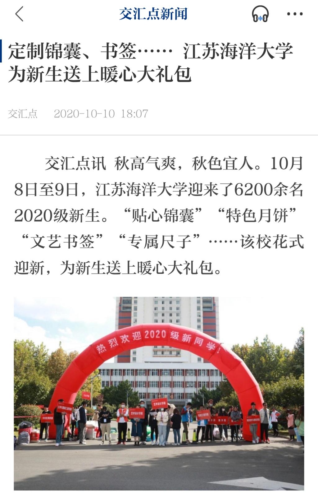 秋高气爽,秋色宜人。10月8日至9日,江苏海洋大学迎来了6200余名2020级新生。“贴心锦囊”“特色月饼”“文艺书签”“专属尺子”……该校花式迎新,为新生送上暖心大礼包。