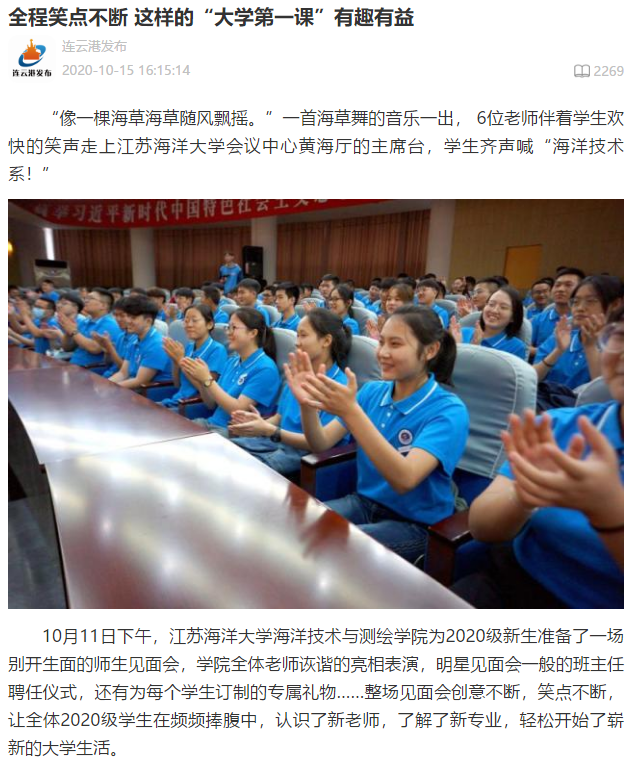 10月11日下午,江苏海洋大学海洋技术与测绘学院为2020级新生准备了一场别开生面的师生见面会,学院全体老师诙谐的亮相表演,明星见面会一般的班主任聘任仪式,还有为每个学生订制的专属礼物……整场见面会创意不断,笑点不断,让全体2020级学生在频频捧腹中,认识了新老师,了解了新专业,轻松开始了崭新的大学生活。