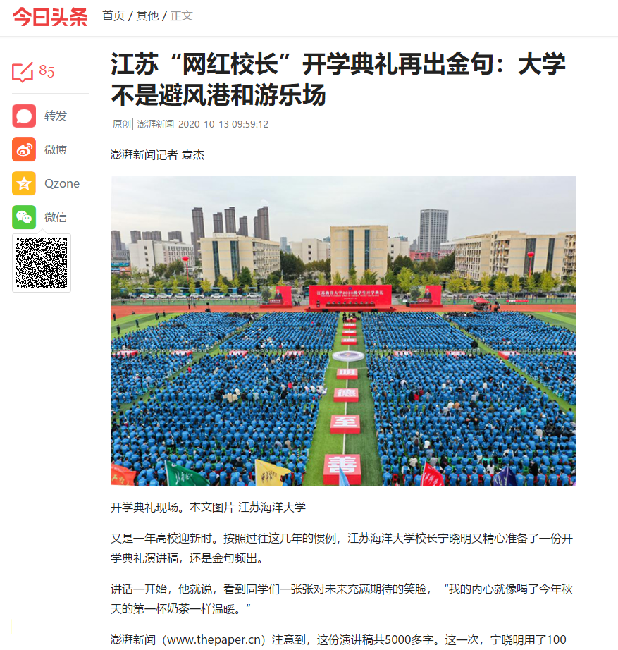 10月11日上午,位于“大圣故里”连云港的江苏海洋大学隆重举行新生开学典礼,该校校长宁晓明进行了发言。
