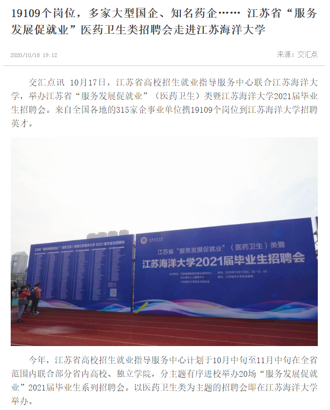 交汇点讯10月17日,江苏省高校招生就业指导服务中心联合江苏海洋大学,举办江苏省“服务发展促就业”(医药卫生)类暨江苏海洋大学2021届毕业生招聘会。来自全国各地的315家企事业单位携19109个岗位到江苏海洋大学招聘英才。