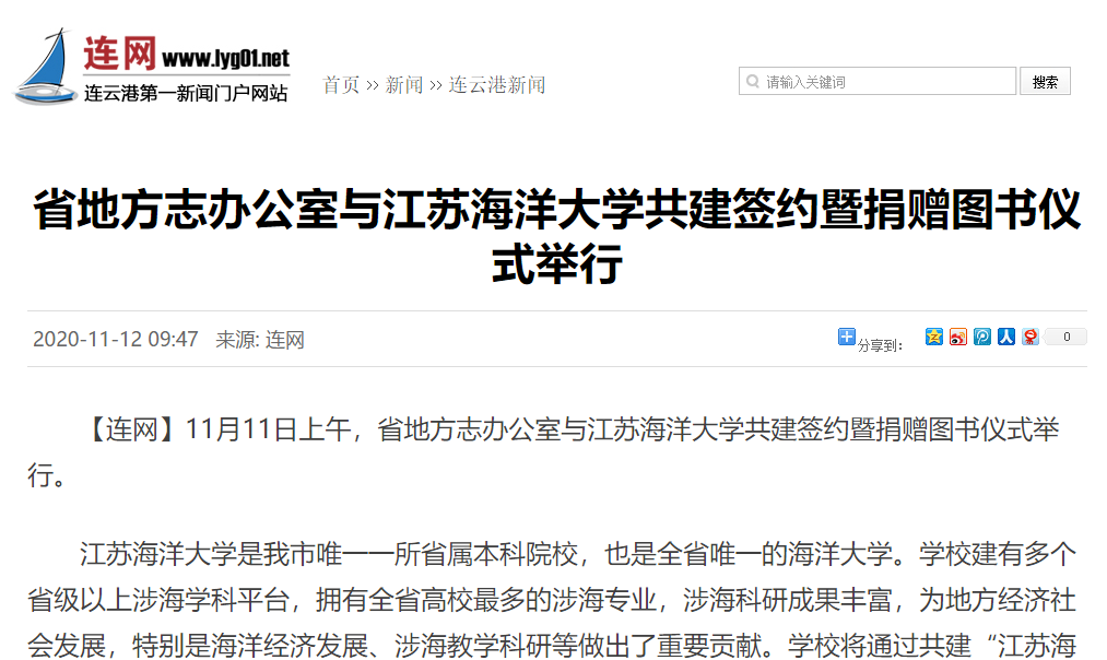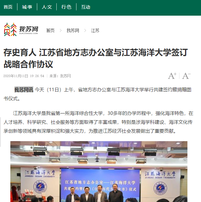 签约揭牌仪式结束后,省地方志办公室开展了加强“四史”学习教育、方志文化进校园活动,向江苏海洋大学捐赠了《江苏历代方志全书》《江苏艺文志》《乾隆江南通志》(点校)、《江苏重大基础设施工程图志(1949—2019)》等史志书籍。