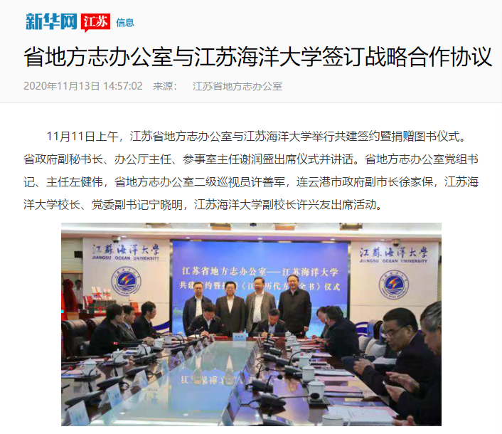11月11日上午,江苏省地方志办公室与江苏海洋大学举行共建签约暨捐赠图书仪式。省政府副秘书长、办公厅主任、参事室主任谢润盛出席仪式并讲话。省地方志办公室党组书记、主任左健伟,省地方志办公室二级巡视员许善军,连云港市政府副市长徐家保,江苏海洋大学校长、党委副书记宁晓明,江苏海洋大学副校长许兴友出席活动。