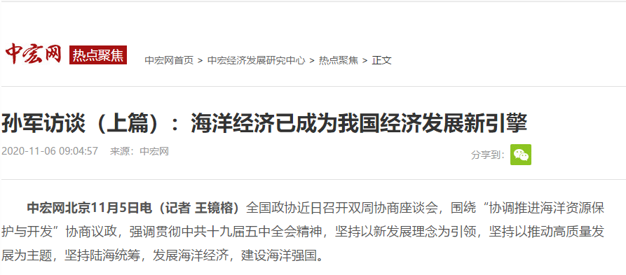 中宏网北京11月6日电(记者 王镜榕)全国政协近日召开双周协商座谈会,围绕“协调推进海洋资源保护与开发”协商议政,强调贯彻中共十九届五中全会精神,坚持以新发展理念为引领,坚持以推动高质量发展为主题,坚持陆海统筹,发展海洋经济,建设海洋强国。