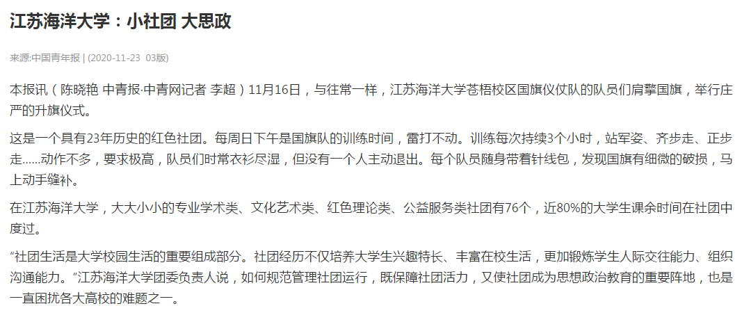 “社团生活是大学校园生活的重要组成部分,社团经历不仅培养大学生兴趣特长、丰富大学生活,更加锻炼学生人际交往能力、组织沟通能力。”江苏海洋大学团委负责人说,如何规范管理社团运行,既保证社团活力,又使社团成为思想政治教育的重要阵地,也一直是困扰各大高校的难题之一。
