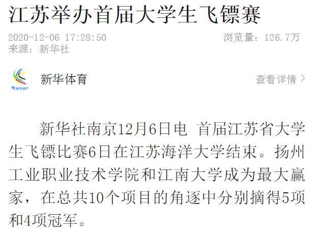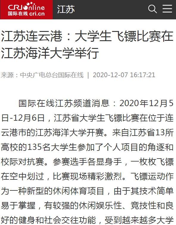 “开展校园体育运动、增强青年学生体魄,是学校落实立德树人根本任务的重要内容。”东道主江苏海洋大学校长宁晓明说,“这次比赛促进了江苏省内高校的体育文化交流,推动了我省飞镖运动的发展。”