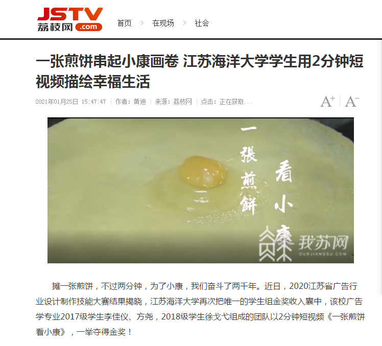 摊一张煎饼,不过两分钟,为了小康,我们奋斗了两千年。近日,2020江苏省广告行业设计制作技能大赛结果揭晓,江苏海洋大学再次把唯一的学生组金奖收入囊中,该校广告学专业2017级学生李佳仪、方尧,2018级学生徐戈弋组成的团队以2分钟短视频《一张煎饼看小康》,一举夺得金奖!