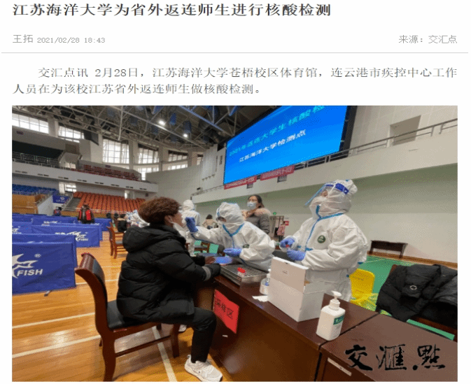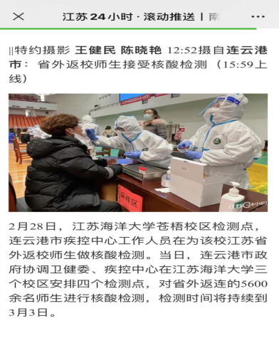 为了落实春季开学期间疫情防控工作要求,在连云港市政府协调,市卫健委、疾控中心的支持下,江苏海洋大学在三个校区安排了四个检测点,对省外返连的5600余名师生进行核酸检测,检测时间将持续到3月3日。(通讯员:王拓)
