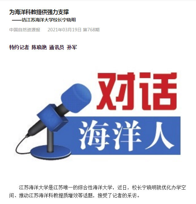 江苏海洋大学是江苏唯一的综合性海洋大学,近日,夜长宁晓明就优化办学空间、推动江苏海洋科教提质增效等话题,择受了记者的采访。