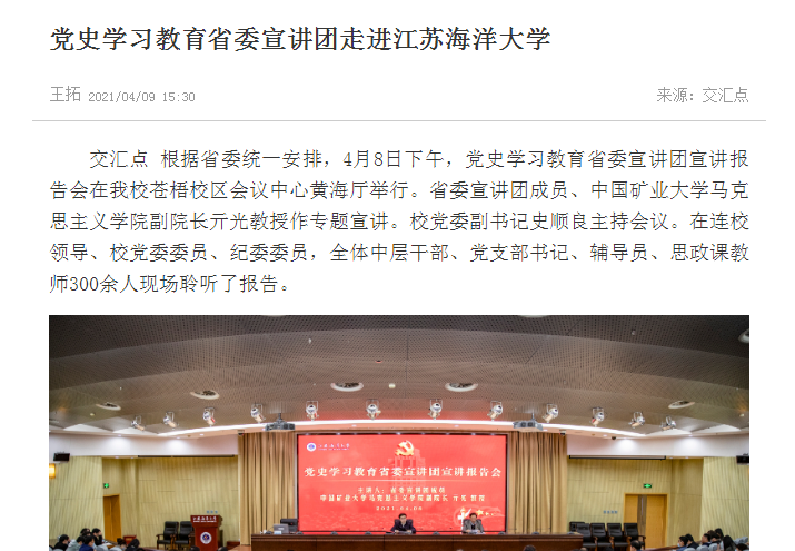 根据省委统一安排,4月8日下午,党史学习教育省委宣讲团宣讲报告会在我校苍梧校区会议中心黄海厅举行。省委宣讲团成员、中国矿业大学马克思主义学院副院长亓光教授作专题宣讲。校党委副书记史顺良主持会议。在连校领导、校党委委员、纪委委员,全体中层干部、党支部书记、辅导员、思政课教师300余人现场聆听了报告。
