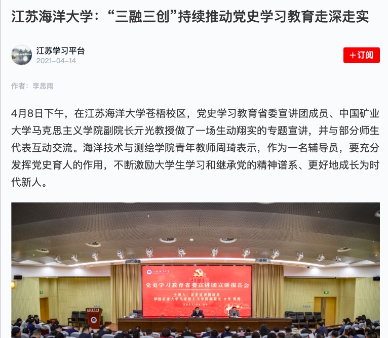 4月8日下午,在江苏海洋大学苍梧校区会议中心黄海厅,党史学习教育省委宣讲团成员、中国矿业大学马克思主义学院副院长亓光教授做了一场生动翔实的专题宣讲,并与部分师生代表互动交流。