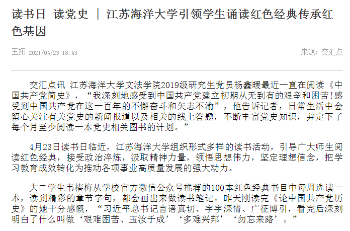 江苏海洋大学文法学院2019级研究生党员杨鑫暖最近一直在阅读《中国共产党简史》,“我深刻地感受到中国共产党建立初期从无到有的艰辛和困苦!感受到中国共产党在这一百年的不懈奋斗和矢志不渝”,他告诉记者,日常生活中会留心关注有关党史的新闻报道以及相关的线上答题,不断丰富党史知识,并定下了每个月至少阅读一本党史相关图书的计划。”