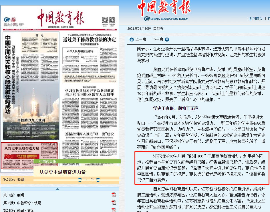 中国教育报 2021年4月30日头版