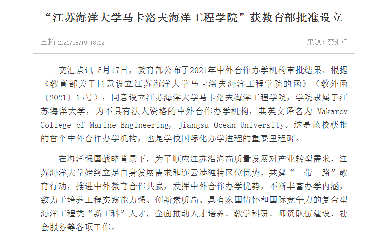 5月17日,教育部公布了2021年中外合作办学机构审批结果。根据《教育部关于同意设立江苏海洋大学马卡洛夫海洋工程学院的函》(教外函〔2021〕15号),同意设立江苏海洋大学马卡洛夫海洋工程学院,学院隶属于江苏海洋大学,为不具有法人资格的中外合作办学机构,其英文译名为 Makarov College of Marine Engineering, Jiangsu Ocean Univer­sity。这是该校获批的首个中外合作办学机构,也是学校国际化办学进程的重要里程碑。