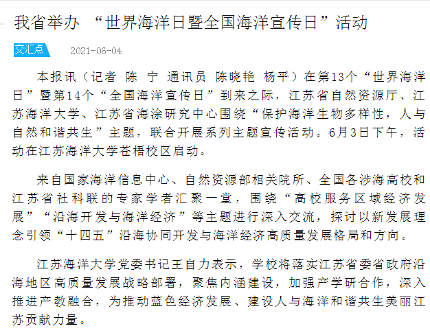 在第13个“世界海洋日”暨第14个“全国海洋宣传日”到来之际,江苏省自然资源厅、江苏海洋大学、江苏省海涂研究中心围绕“保护海洋生物多样性,人与自然和谐共生”主题,联合开展系列主题宣传活动。6月3日下午,活动在江苏海洋大学苍梧校区启动。