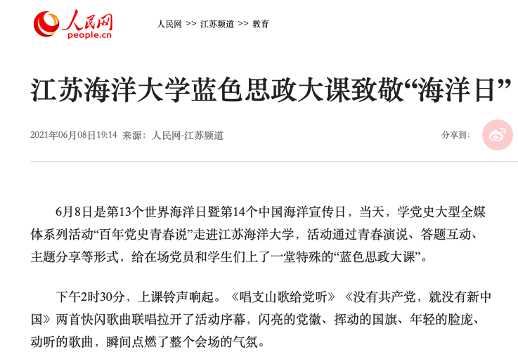 6月8日是第13个世界海洋日暨第14个中国海洋宣传日,当天,学党史大型全媒体系列活动“百年党史青春说”走进江苏海洋大学,活动通过青春演说、答题互动、主题分享等形式,给在场党员和学生们上了一堂特殊的“蓝色思政大课”。