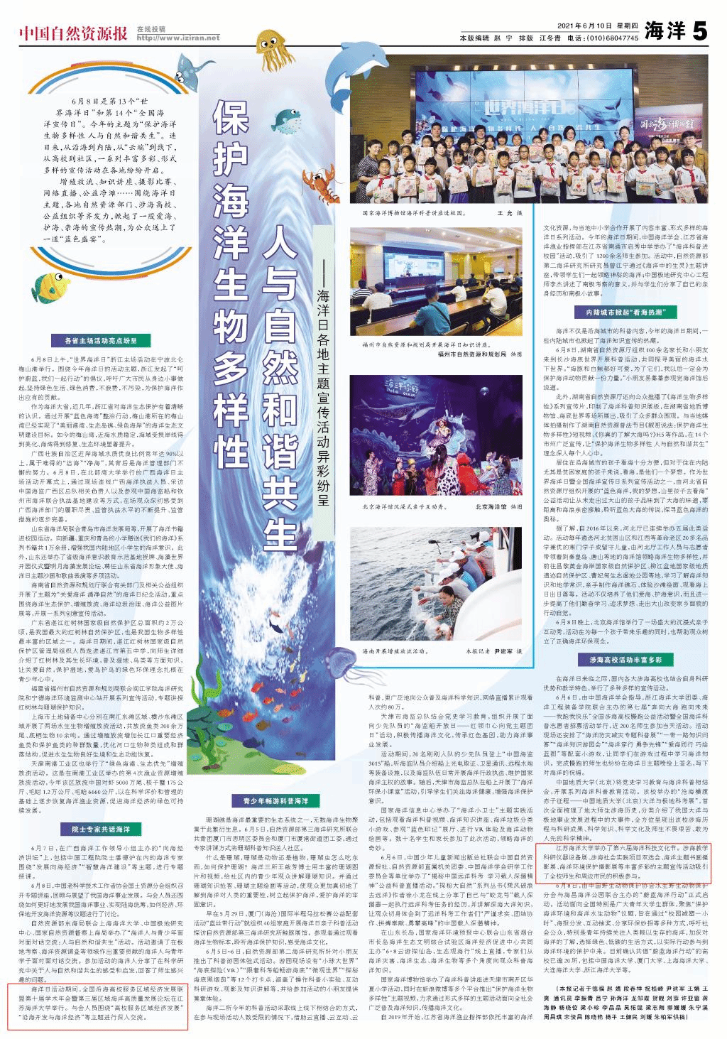 6月8日是第13个“世界海洋日”和第14个“全国海洋宣传日”。今年的主题为“保护海洋生物多样性人与自然和谐共生”。连日来,从沿海到内陆,从“云端”到线下,从高校到社区,一系列丰富多彩、形式多样的宣传活动在各地纷纷开启。