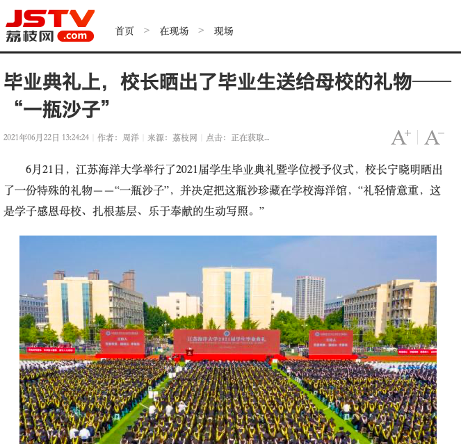 6月21日,江苏海洋大学举行了2021届学生毕业典礼暨学位授予仪式,校长宁晓明晒出了一份特殊的礼物——“一瓶沙子”,并决定把这瓶沙珍藏在学校海洋馆,“礼轻情意重,这是学子感恩母校、扎根基层、乐于奉献的生动写照。”