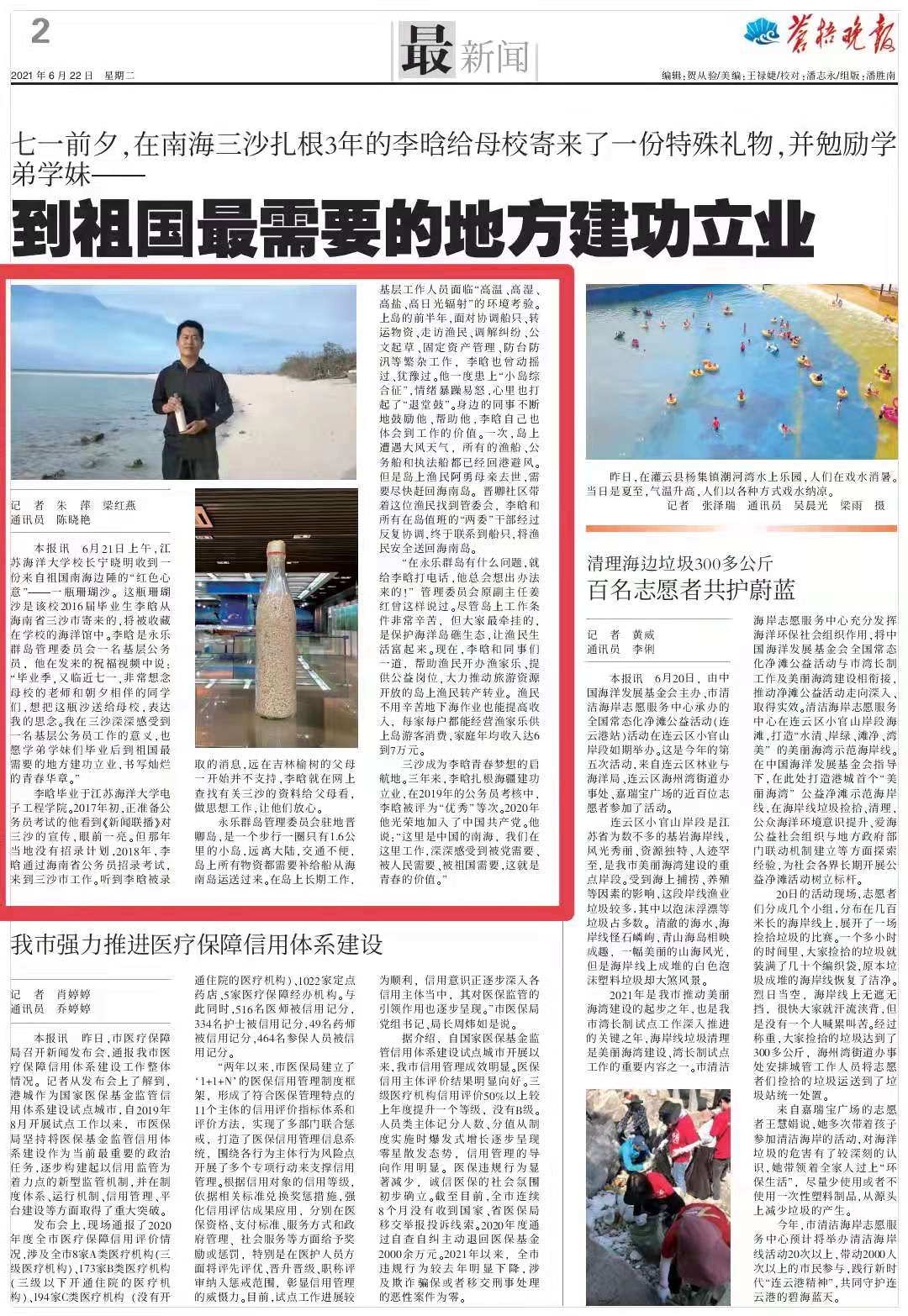 “三沙这个地方,值得我付出,”面对记者,李晗的目光透着坚毅,“这里是中国的南海,我们在这里工作,深深感受到被党需要,被人民需要,被祖国需要,这就是青春的价值。”李晗渐渐找到了工作的意义。(通讯员:陈晓艳)