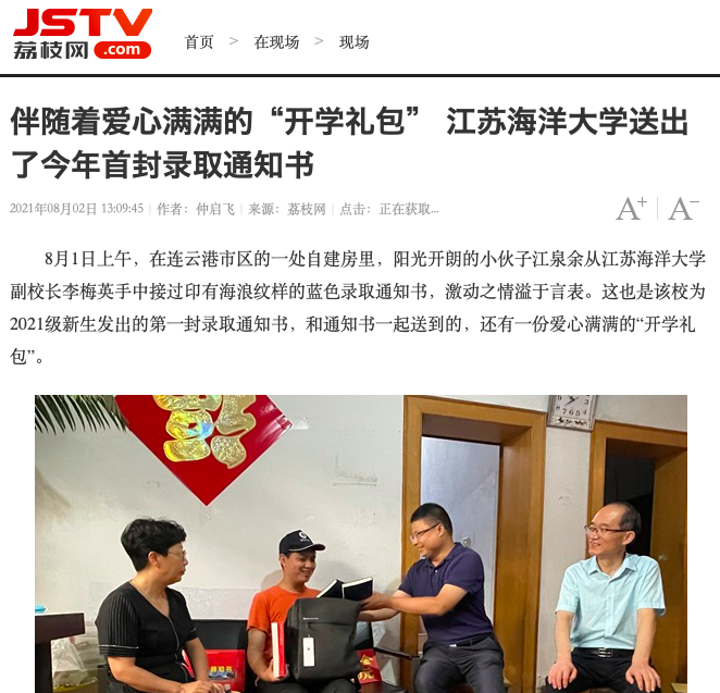 8月1日上午,在连云港市区的一处自建房里,阳光开朗的小伙子江泉余从江苏海洋大学副校长李梅英手中接过印有海浪纹样的蓝色录取通知书,激动之情溢于言表。这也是该校为2021级新生发出的第一封录取通知书,和通知书一起送到的,还有一份爱心满满的“开学礼包”。