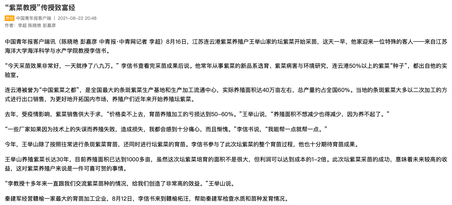 “李教授十多年来一直跟我们交流紫菜苗种的情况,给我们创造了非常高的效益。”王举山说。