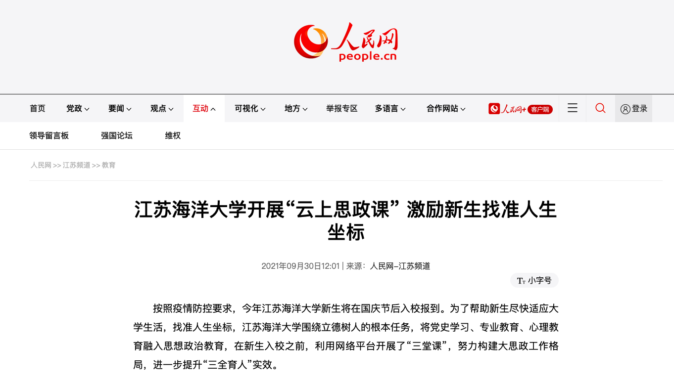 按照疫情防控要求,今年江苏海洋大学新生将在国庆节后入校报到。为了帮助新生尽快适应大学生活,找准人生坐标,江苏海洋大学围绕立德树人的根本任务,将党史学习、专业教育、心理教育融入思想政治教育,在新生入校之前,利用网络平台开展了“三堂课”,努力构建大思政工作格局,进一步提升“三全育人”实效。