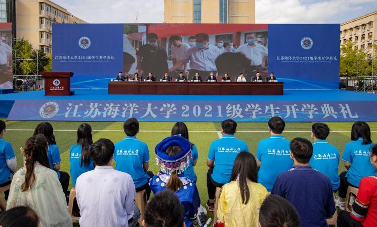 最后,校学生会执行主席秦晨尧同学带领2021级新生进行了入学宣誓,全场师生齐唱江苏海洋大学校歌《蔚蓝的信仰》。