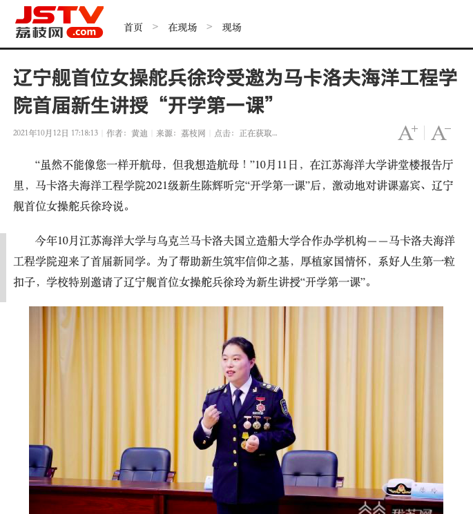 今年10月江苏海洋大学与乌克兰马卡洛夫国立造船大学合作办学机构——马卡洛夫海洋工程学院迎来了首届新同学。为了帮助新生筑牢信仰之基,厚植家国情怀,系好人生第一粒扣子,学校特别邀请了辽宁舰首位女操舵兵徐玲为新生讲授“开学第一课”。