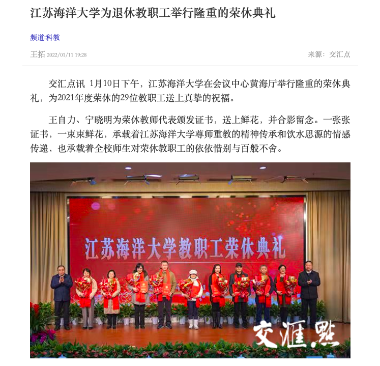 1月10日下午,江苏海洋大学在会议中心黄海厅举行隆重的荣休典礼,为2021年度荣休的29位教职工送上真挚的祝福。