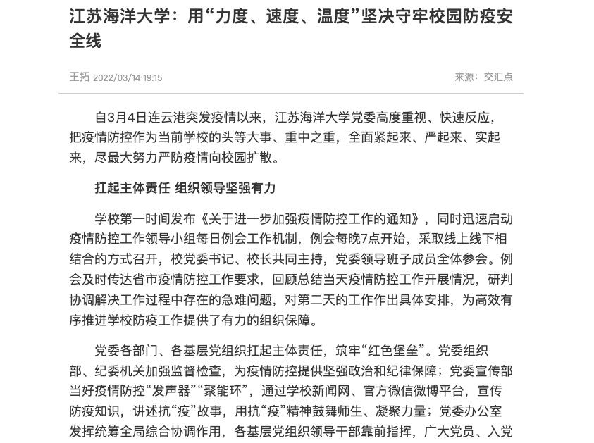 自3月4日连云港突发疫情以来,江苏海洋大学党委高度重视、快速反应,把疫情防控作为当前学校的头等大事、重中之重,全面紧起来、严起来、实起来,尽最大努力严防疫情向校园扩散。