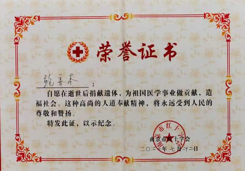 鲍善本作为新增遗体捐赠志愿者,即将成为东大医学院的一名无语体师,他的家人也将于8月到南京市遗体器官捐献者纪念林参加缅怀纪念仪式。