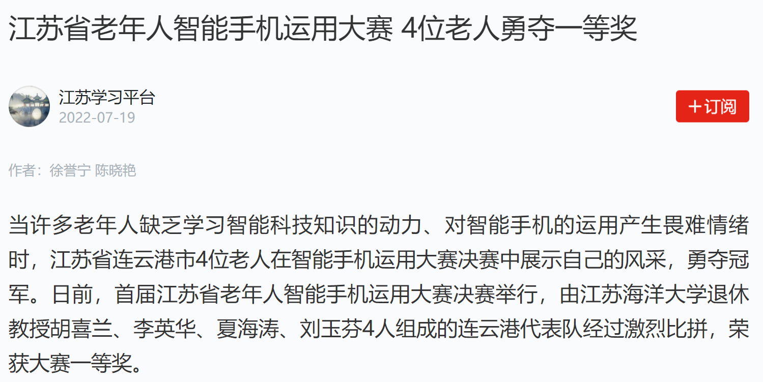 当许多老年人缺乏学习智能科技知识的动力、对智能手机的运用产生畏难情绪时,江苏省连云港市4位老人在智能手机运用大赛决赛中展示自己的风采,勇夺冠军。日前,首届江苏省老年人智能手机运用大赛决赛举行,由江苏海洋大学退休教授胡喜兰、李英华、夏海涛、刘玉芬4人组成的连云港代表队经过激烈比拼,荣获大赛一等奖。