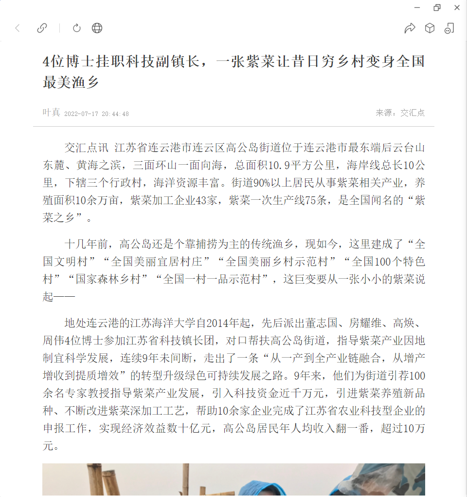 地处连云港的江苏海洋大学自2014年起,先后派出董志国、房耀维、高焕、周伟4位博士参加江苏省科技镇长团,对口帮扶高公岛街道,指导紫菜产业因地制宜科学发展,连续9年未间断,走出了一条“从一产到全产业链融合,从增产增收到提质增效”的转型升级绿色可持续发展之路。9年来,他们为街道引荐100余名专家教授指导紫菜产业发展,引入科技资金近千万元,引进紫菜养殖新品种、不断改进紫菜深加工工艺,帮助10余家企业完成了江苏省农业科技型企业的申报工作,实现经济效益数十亿元,高公岛居民年人均收入翻一番,超过10万元。