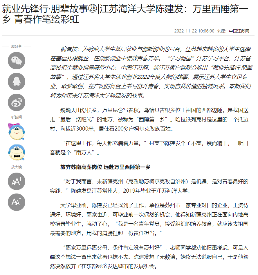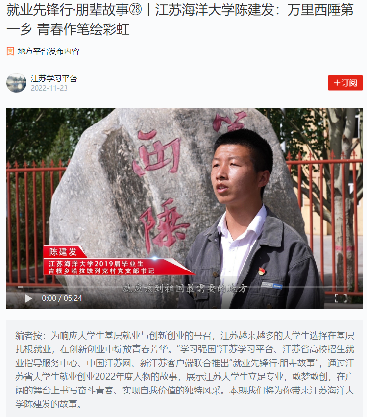 编者按:为响应大学生基层就业与创新创业的号召,江苏越来越多的大学生选择在基层扎根就业,在创新创业中绽放青春芳华。“学习强国”江苏学习平台、江苏省高校招生就业指导服务中心、中国江苏网、新江苏客户端联合推出“就业先锋行·朋辈故事”,通过江苏省大学生就业创业2022年度人物的故事,展示江苏大学生立足专业,敢梦敢创,在广阔的舞台上书写奋斗青春、实现自我价值的独特风采。本期我们将为你带来江苏海洋大学陈建发的故事。