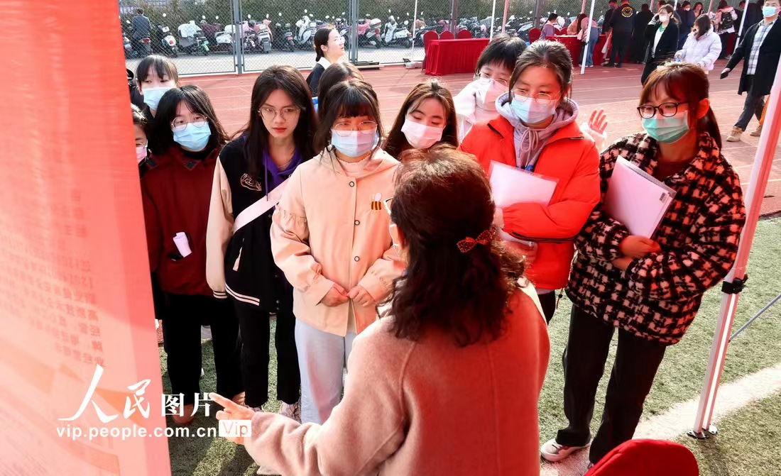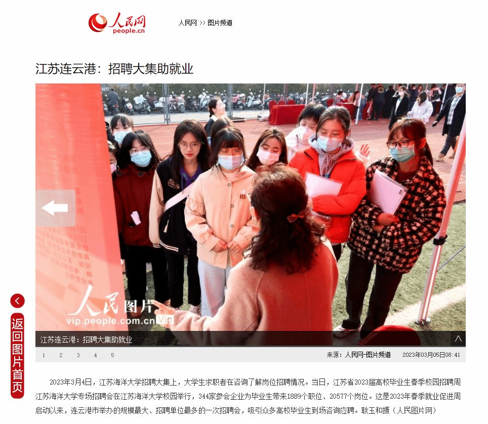 2023年3月4日,江苏海洋大学招聘大集上,大学生求职者在咨询了解岗位招聘情况。当日,江苏省2023届高校毕业生春季校园招聘周江苏海洋大学专场招聘会在江苏海洋大学校园举行,344家参会企业为毕业生带来1889个职位、20577个岗位。这是2023年春季就业促进周启动以来,连云港市举办的规模最大、招聘单位最多的一次招聘会,吸引众多高校毕业生到场咨询应聘。