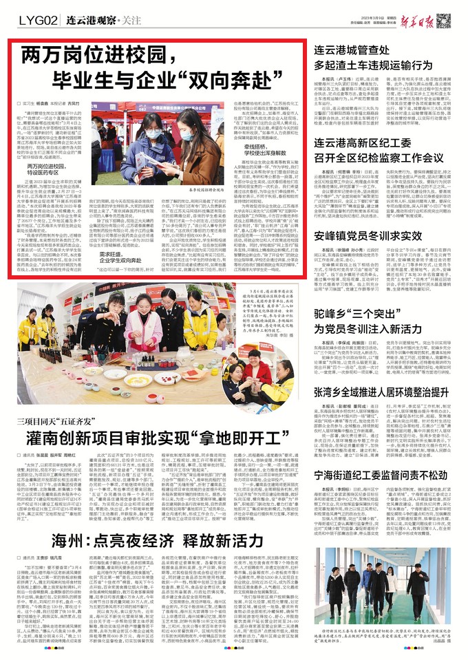 “请问管培生岗位主要是干什么的呢?”“我想试一试这个直播运营的岗位,需要具备哪些技能呢?”3月4日上午,在江苏海洋大学苍梧校区东体育场内,一场“逐梦新时代 建功新征程”江苏省2023届高校毕业生春季校园招聘周江苏海洋大学专场招聘会正如火如荼地进行。现场,来自连云港市各大院校的毕业生们正围在不同企业的“摊位”前仔细咨询,投递简历。