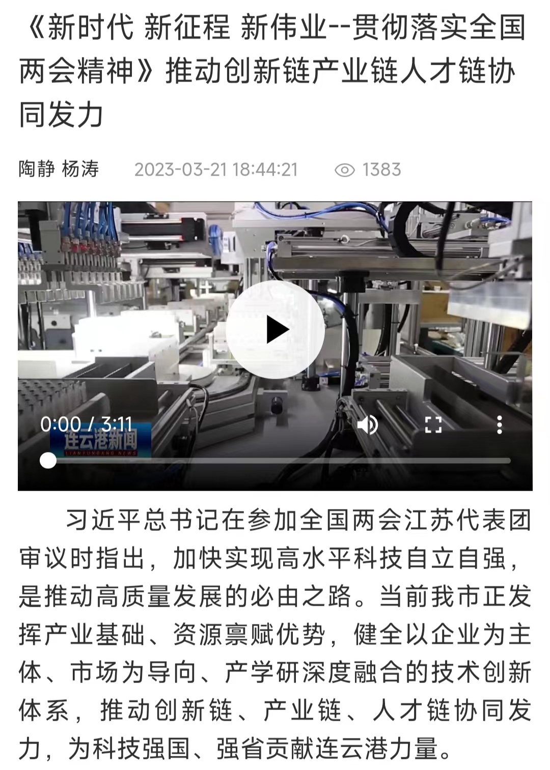习近平总书记在参加全国两会江苏代表团审议时指出,加快实现高水平科技自立自强,是推动高质量发展的必由之路。当前我市正发挥产业基础、资源禀赋优势,健全以企业为主体、市场为导向、产学研深度融合的技术创新体系,推动创新链、产业链、人才链协同发力,为科技强国、强省贡献连云港力量。