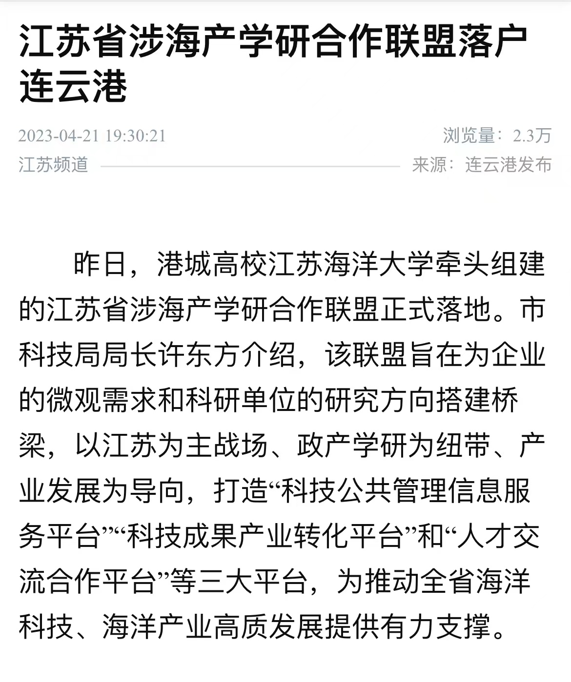 昨日,港城高校江苏海洋大学牵头组建的江苏省涉海产学研合作联盟正式落地。市科技局局长许东方介绍,该联盟旨在为企业的微观需求和科研单位的研究方向搭建桥梁,以江苏为主战场、政产学研为纽带、产业发展为导向,打造“科技公共管理信息服务平台”“科技成果产业转化平台”和“人才交流合作平台”等三大平台,为推动全省海洋科技、海洋产业高质发展提供有力支撑。