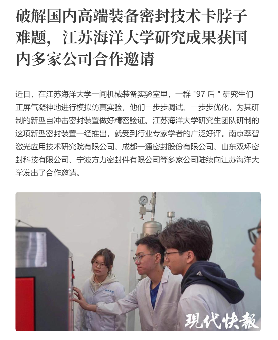 从" 实验室 " 走进 " 生产线 ",江苏海洋大学研究生团队将科技创新转化为产品创造。在这个新型密封装置研发的背后,有着原创密封技术的有力支撑,这也是实现国内高端装备密封核心技术攻关的关键。