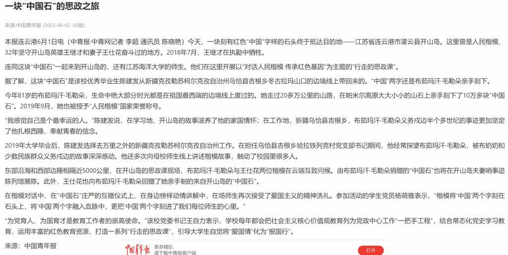 据了解,这块“中国石”是该校优秀毕业生陈建发从新疆克孜勒苏柯尔克孜自治州乌恰县吉根乡冬古拉玛山口的边境线上带回来的。“中国”两字还是布茹玛汗·毛勒朵亲手刻下。