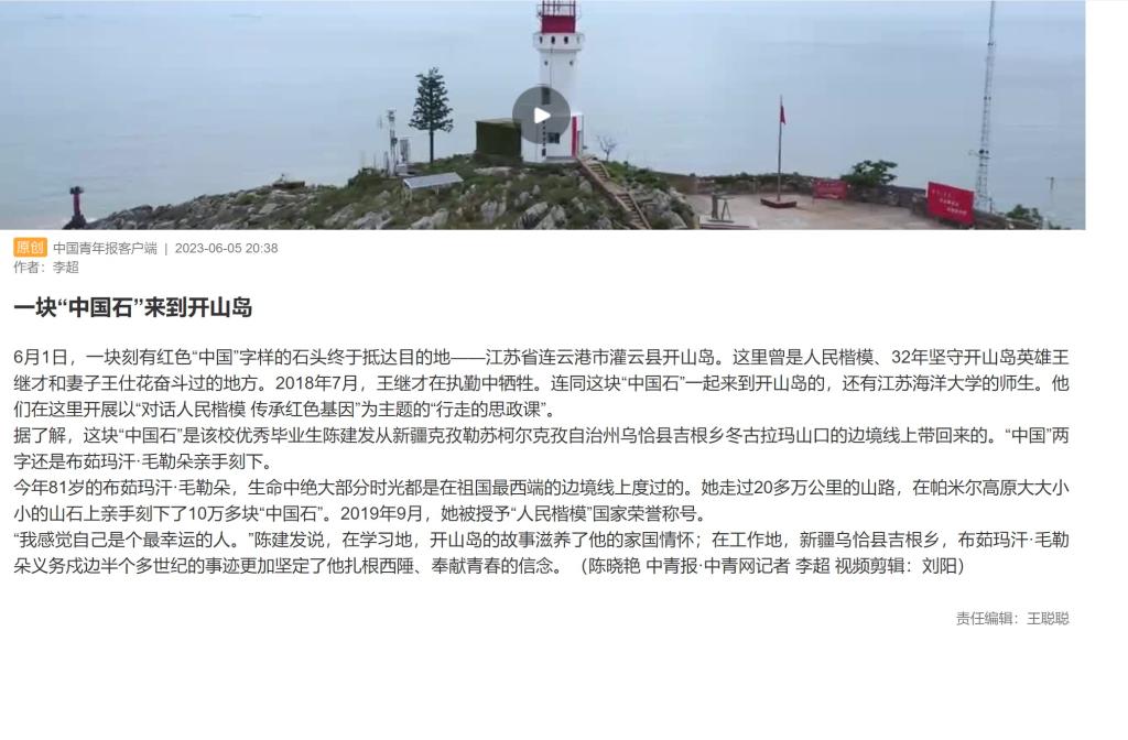 6月1日,一块刻有红色“中国”字样的石头终于抵达目的地——江苏省连云港市灌云县开山岛。这里曾是人民楷模、32年坚守开山岛英雄王继才和妻子王仕花奋斗过的地方。2018年7月,王继才在执勤中牺牲。连同这块“中国石”一起来到开山岛的,还有江苏海洋大学的师生。他们在这里开展以“对话人民楷模 传承红色基因”为主题的“行走的思政课”。 据了解,这块“中国石”是该校优秀毕业生陈建发从新疆克孜勒苏柯尔克孜自治州乌恰县吉根乡冬古拉玛山口的边境线上带回来的。“中国”两字还是布茹玛汗·毛勒朵亲手刻下。 今年81岁的布茹玛汗·毛勒朵,生命中绝大部分时光都是在祖国最西端的边境线上度过的。她走过20多万公里的山路,在帕米尔高原大大小小的山石上亲手刻下了10万多块“中国石”。2019年9月,她被授予“人民楷模”国家荣誉称号。 “我感觉自己是个最幸运的人。”陈建发说,在学习地,开山岛的故事滋养了他的家国情怀;在工作地,新疆乌恰县吉根乡,布茹玛汗·毛勒朵义务戍边半个多世纪的事迹更加坚定了他扎根西陲、奉献青春的信念。(通讯员:陈晓艳 )