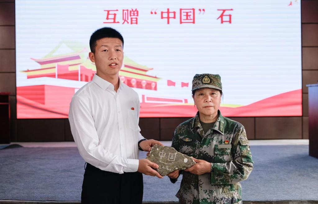 在楷模对话后,进行了黄海前哨开山岛“中国”石与西陲边疆冬古拉玛边境线上的“中国”石互赠的庄严仪式。陈建发代表人民楷模布茹玛汗·毛勒朵向开山岛夫妻哨事迹陈列馆捐赠“中国”石。王仕花向布茹玛汗·毛勒朵捐赠开山岛“中国”石,由陈建发代表布茹玛汗·毛勒朵郑重接收。