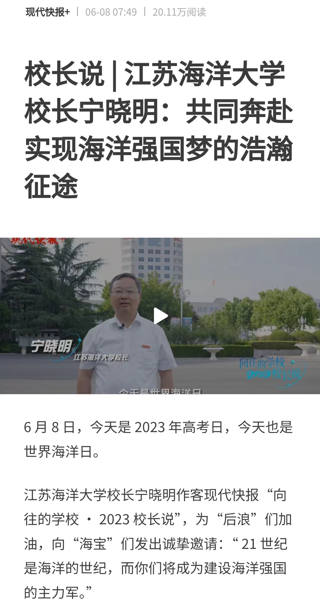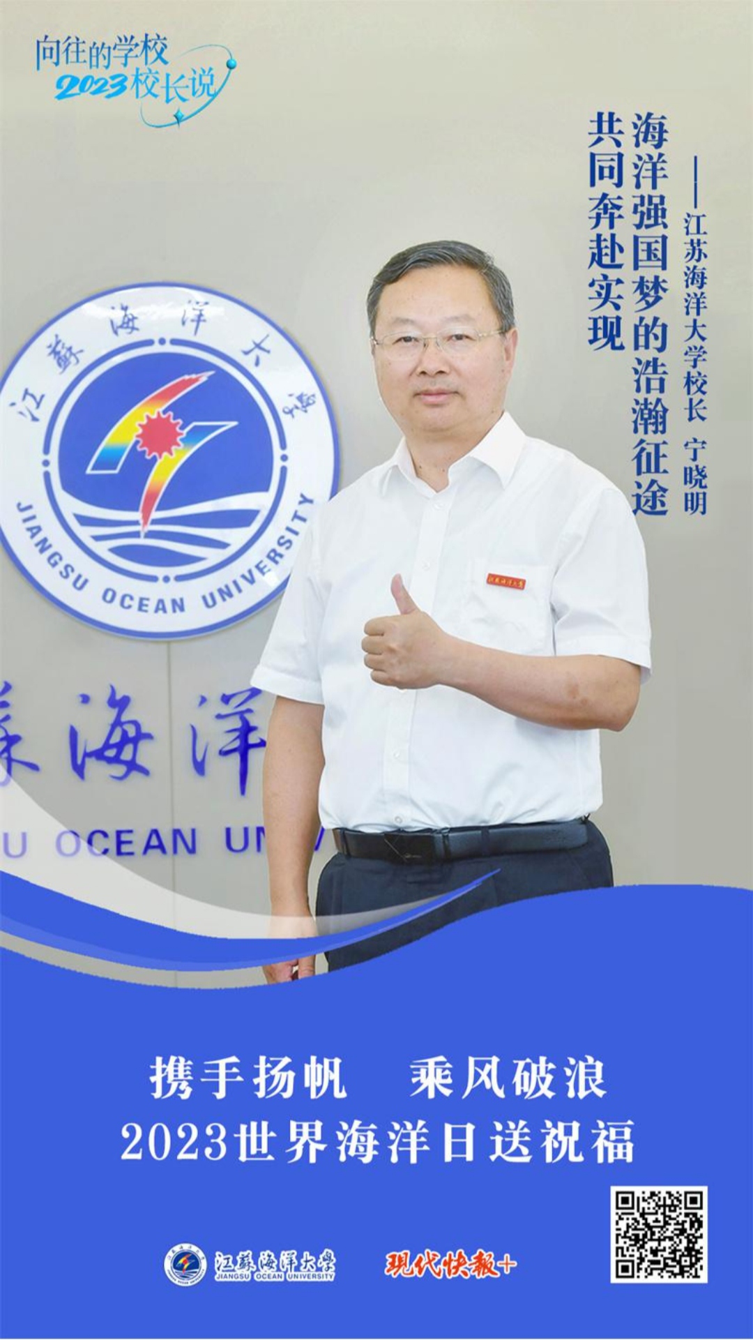 江苏海洋大学校长宁晓明作客现代快报“向往的学校· 2023校长说”,为“后浪”们加油,向“海宝”们发出诚挚邀请:“ 21世纪是海洋的世纪,而你们将成为建设海洋强国的主力军。”